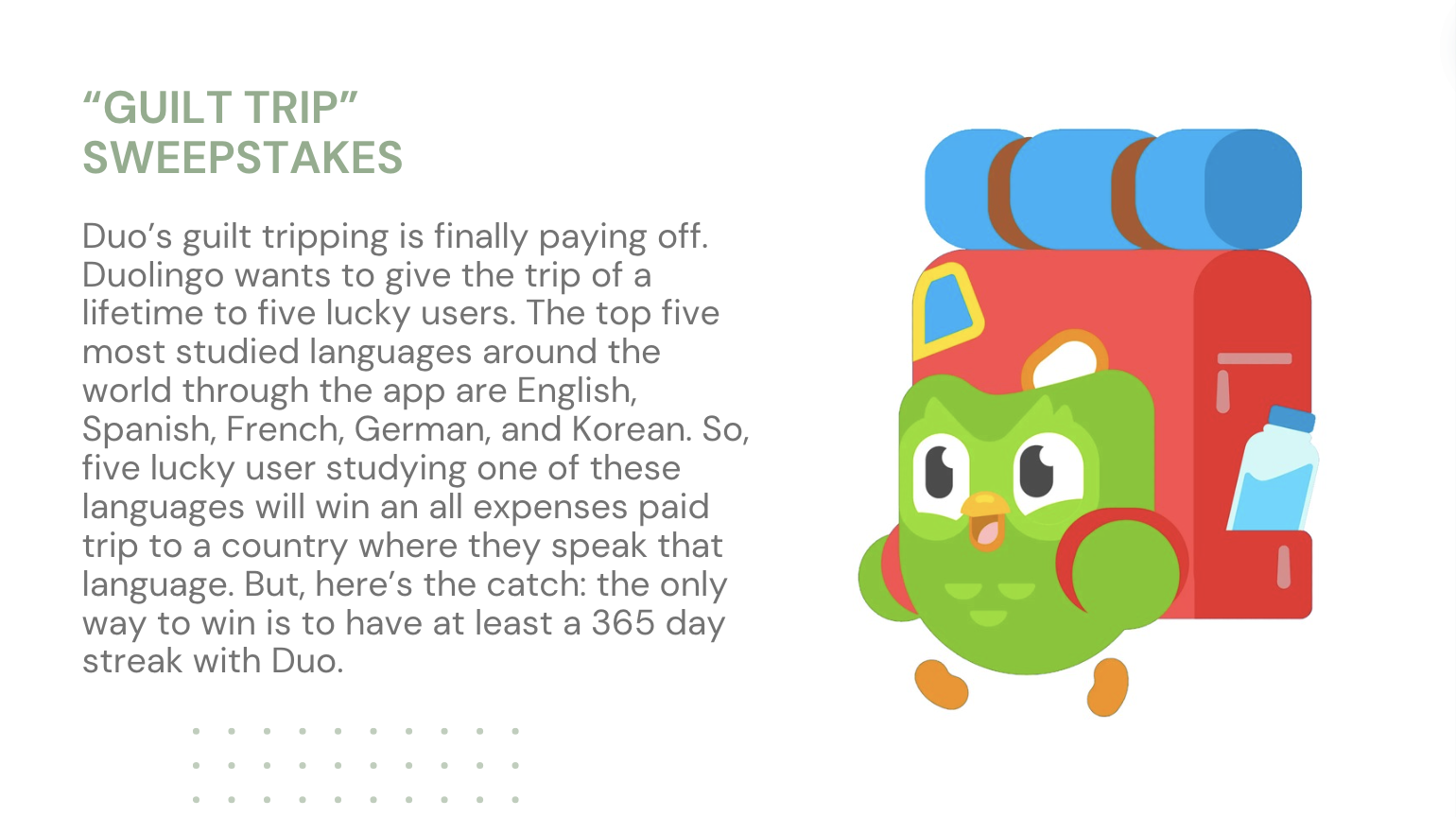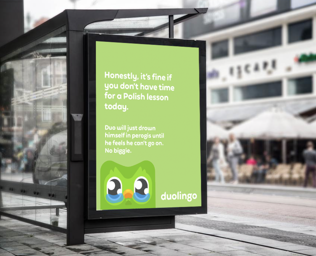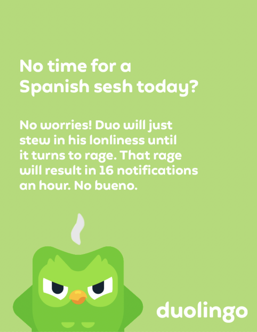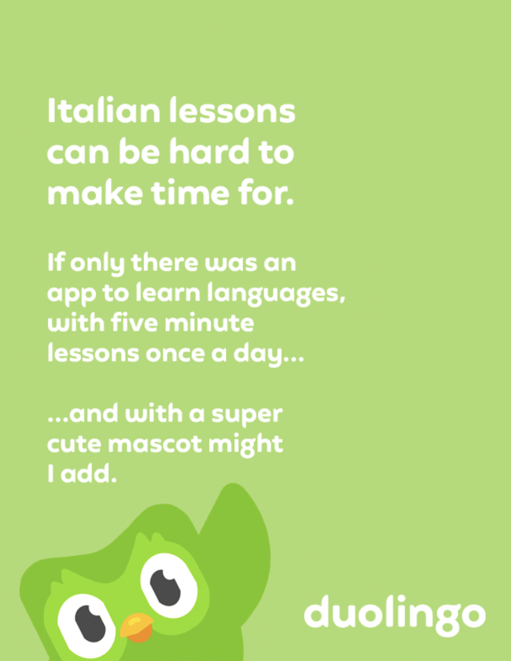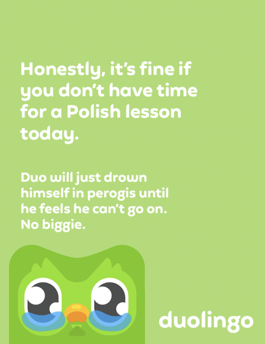Duolingo is the easiest and quickest way to start learning a new language. With its 15 minute a day lessons and quirky mascot, Duolingo makes learning fun and entertaining. With this campaign, it encourages people to keep a streak and not to leave Duo hanging because all he wants is for you to learn with him!